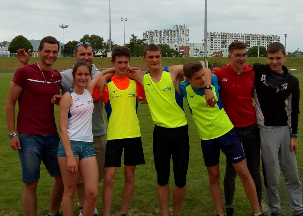 Clémence après son récent titre départementale chez les minimes 2 espérait décrocher une des trois premières places. Malheureusement un concours du disque en dessous de ses performances habituelles l'obligera a se contenter de la 7eme place au générale avec 100 points (27m06 au disque, 30m60 au marteau et 7'20'' sur 2000m). Mais notre jeune championne garde le sourire sur le podium et a peine descendue de celui-ci son regard se tourne déjà vers les régionaux individuels ou elle s'alignera sur 3 épreuves (disque, marteau et 2000m). Chez les garçons Jonas privé de course a cause de sa jambe encore fragile ne sera pas classé au triathlon. Il réalise néanmoins une très belle compétition (1m68 à la hauteur, 38m45 au marteau et 11m16 poids). Lui aussi s'alignera sur ces trois épreuves lors des régionaux le 9 juin prochain à Coulaines. François réalise également une très belle compétition il décroche une belle 21éme place avec 91 point, bat son record personnel sur 1000m en 2'50''05, réalise 6''83 au 50m et 10m66 au triple. Lui aussi pourra défendre ses chances aux régionaux sur 100m et peut être sur 50m. Pierre pour sa première année chez les minimes réalise le 4eme temps de la journée sur 50m en 6''77, retombe à 10m39 au triple et boucle le 1000m en 3'13'' et prend une prometteuse 58ème place avec 75 points. Il sera également à Coulaines sur 50m et 200 haies.