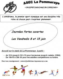 Les Vendredis 8 et 15 juin Accueil sur le stade de La Pommeraye à partir : - de 18 h jusqu'à 19 h 15 pour les jeunes jusqu'à cadets. (1994) - De 19h15 à 20h 30 pour les adultes compétitions ou loisirs.