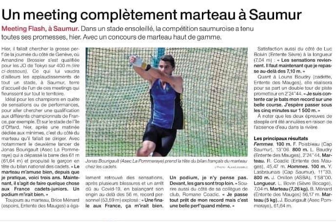 Pour finir la journée, Jonas se positionne dans l'air de marteau pour espérer une qualification au championnat de France. Au premier lancé, Jonas envoie son engin à 58m, ce qui lui permet de se qualifier au championnat de France et de passer premier au bilan français. Après s'être remis de cette performance, Jonas se remet en position pour son deuxième essai, avec de superbes sensations, il envoie son marteau au-delà des 61m (61m64) ce qui lui permet de prendre 4m d'avance sur le deuxième du bilan.